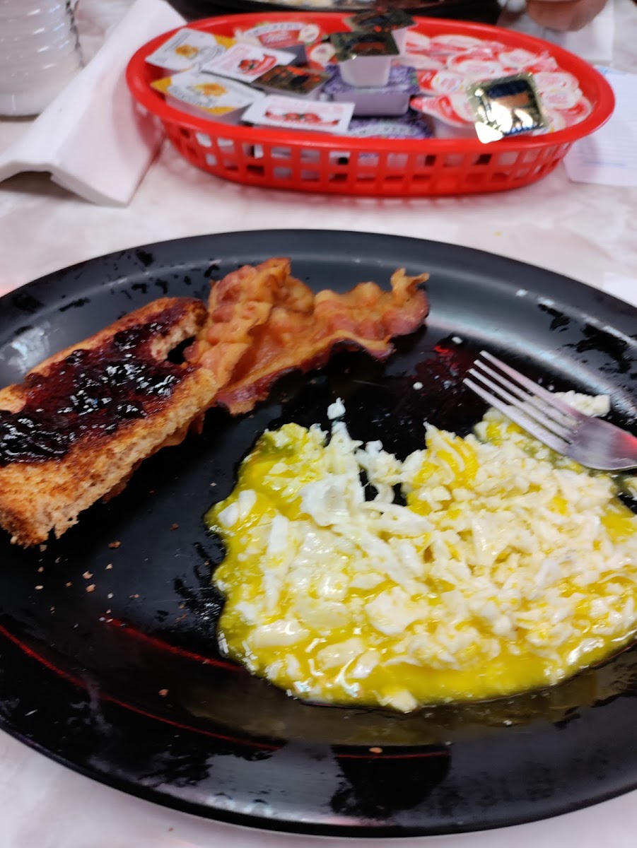 Another popular option includes the traditional breakfast plate with bacon, eggs, hash browns, and wheat toast. This meal represents the classic diner breakfast that many people enjoy at any time of the day.
